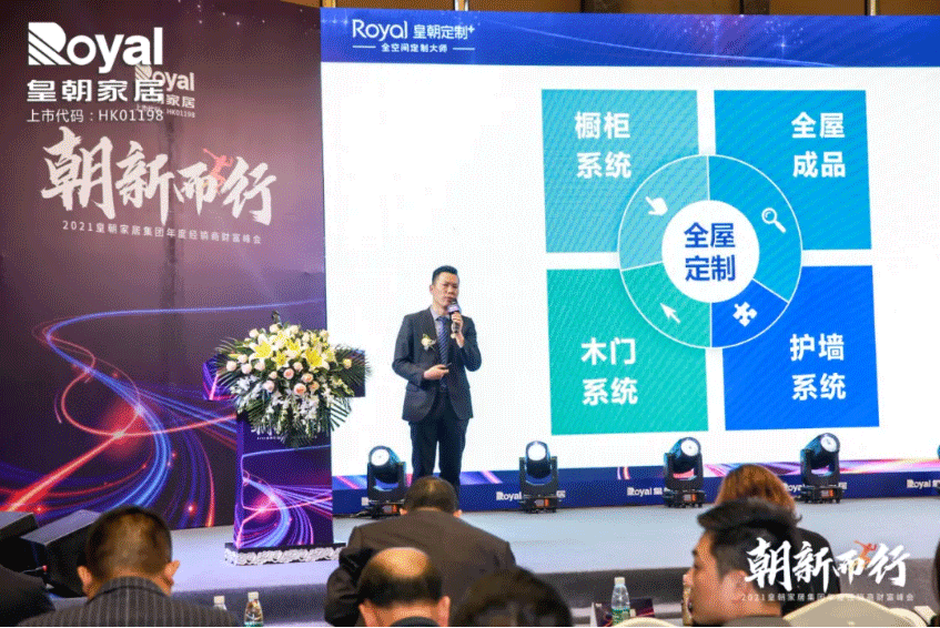 随后,皇朝整体家居产品开发部总监陈繁先生发布了2021皇朝整体家居新品及营销政策,新品仍然以“艺术家居 全屋整案”为定位,通过个性化定制实现不同人对家居的个性要求,打造一体化的整体空间感受。