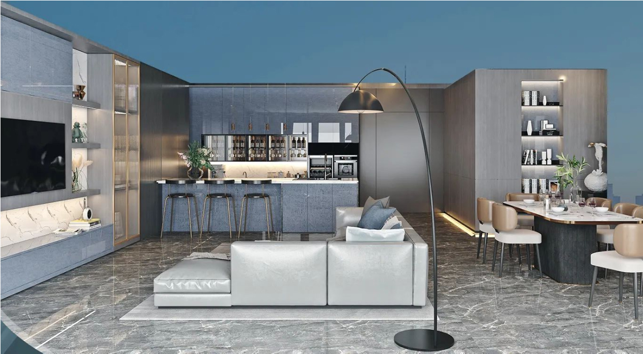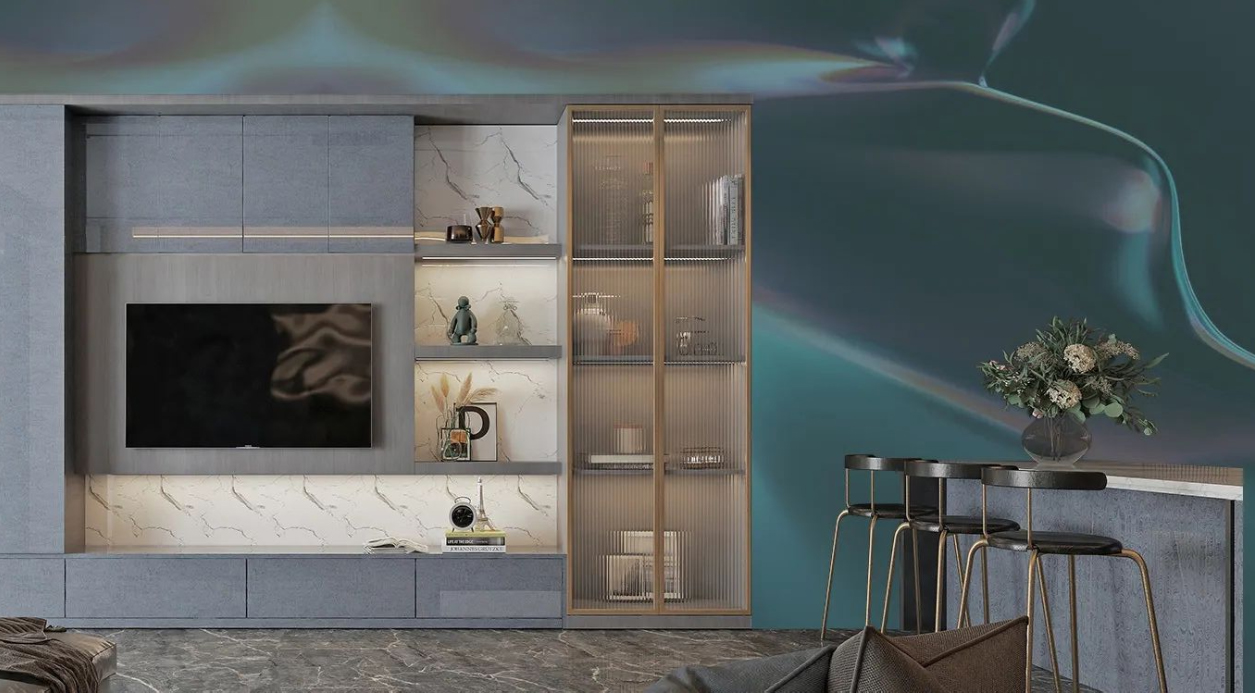 电视护墙选用墨蓝色背板 草莓影视,嵌入肤感吊柜, .