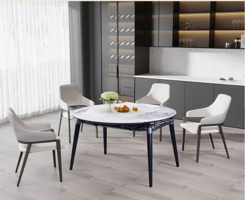 户型餐桌要怎么选才能既省空间又不失美感?MSN2206可伸缩餐桌,简直是小户型的福音!可拉伸的设计,让它可以根据不同场景变换不同的形态,用餐人少时方桌占地少,人多时只需将两侧的半月板拉出,秒变大气圆桌,再多的美味佳肴也放得下!台面选用了香奈儿岩板,纹理写意,淡雅素净;同时,它还具备耐刮磨、耐高温、高密度、食品级别安全等优点,高颜值性能出众。木质导轨质感十足,推拉静音无卡顿,而且还会越用越顺滑;同时桌脚采用了八字斜角设计,视觉上美观通透,日常满足餐椅收纳,打扫卫生也很省心。就餐想要更有仪式感,那就少不了米奢这款雅致餐椅。环抱舒适靠背和宽大海绵座包,落座更惬意,吃饭也更香了!这样舒适与自在的餐厅,真的很难不心动!