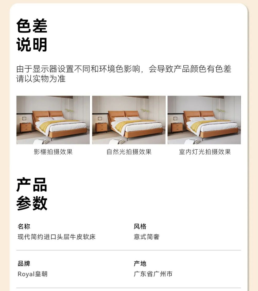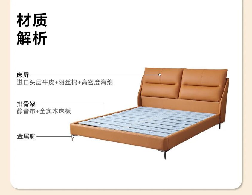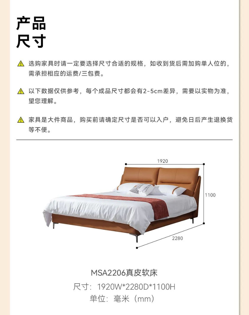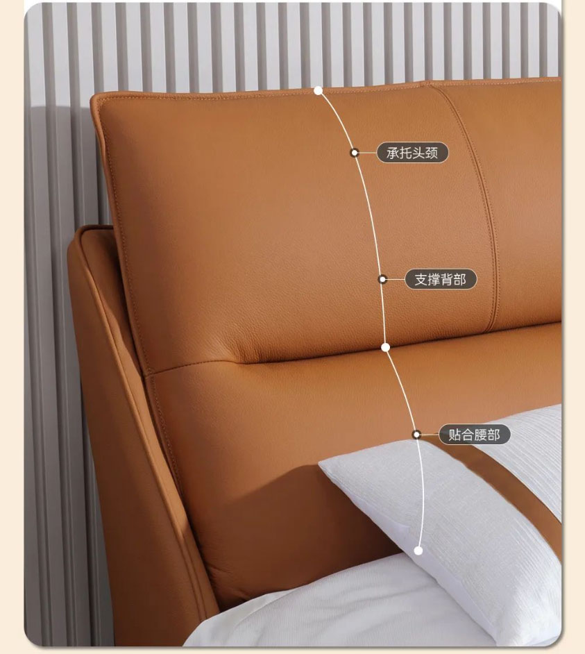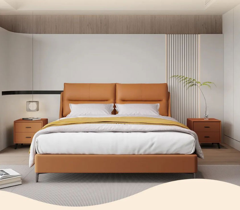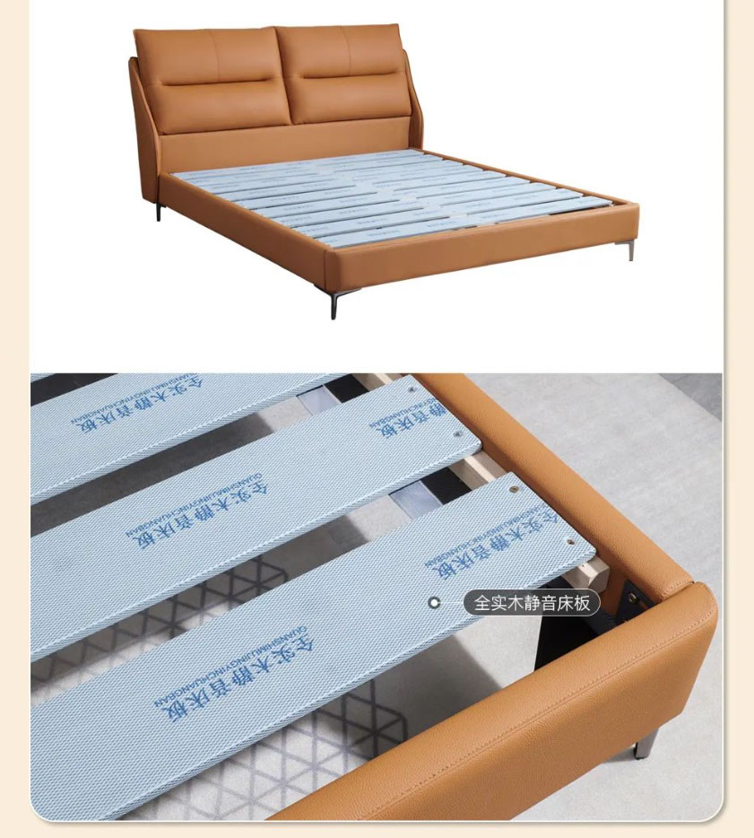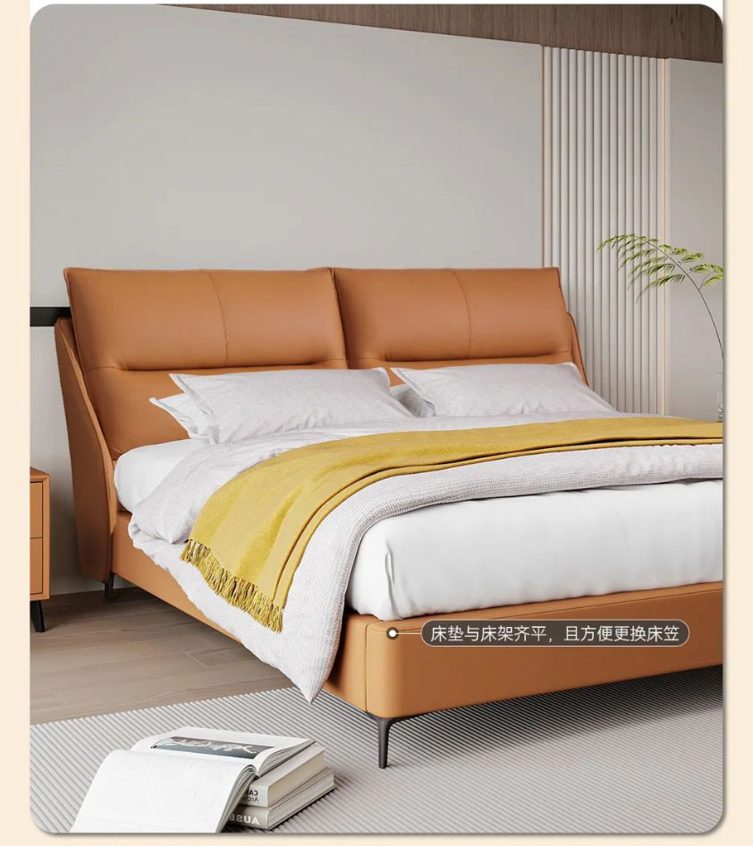 Royal草莓影视米奢系列明星产品软床暖阳,以清新而夺目的橙色系,给整个空间带来无限活力。面料选用进口头层牛皮,质地柔软细腻,触感亲肤舒适;自带倾斜角度的床屏,能更好地贴合我们倚靠时的身体曲线;左右分区双靠包,内部填充高密度高回弹海绵,靠感软弹舒适,轻松消弭一天的疲惫;三面窄边的设计,尽可能避免空间浪费,适配各种现代户型;全实木静音排骨架,结实稳固无异响,让你一觉安睡到天亮;金属床脚高挑轻盈,视觉效果更通透,也方便扫地机日常清洁。搭配的同色系床头柜,高颜值又实用,整体风格简约和谐,营造个性精致、温馨舒适的卧室氛围。