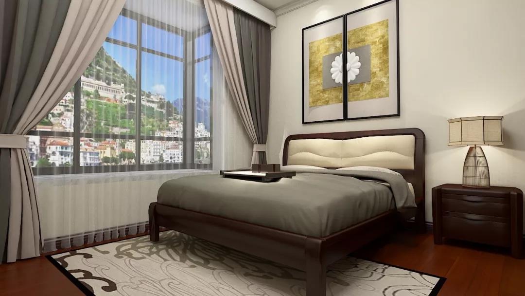 灰色的床品与窗帘呼应,纹理简单的地毯并不突兀,卧室的色调都比较淡雅,墙上的装饰画丰富了空间色彩。