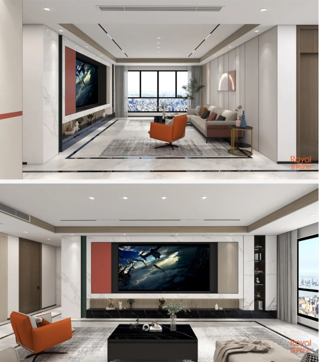 活泼的橙红色点缀在栗黄色构建的空间,设计没有一丝多余。