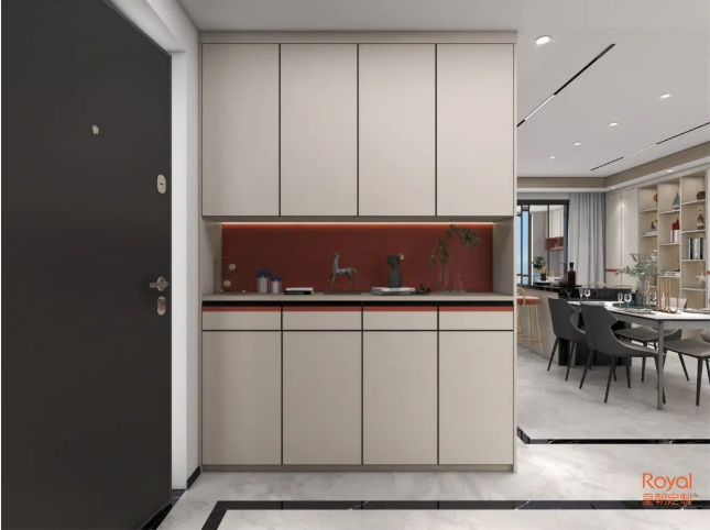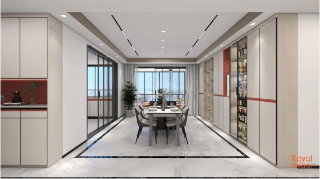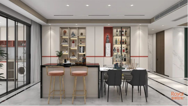 创造性地将酒柜吧台和餐桌融合在餐厅中,丰富的功能,利落的视觉效果,简单且精致。