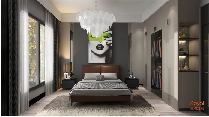 位于二层的主卧,功能区分更为细致,满墙做满柜,棕灰色如同大地一般,充满着力量。多种元素的组合,在一个空间里产生动与静的平衡。