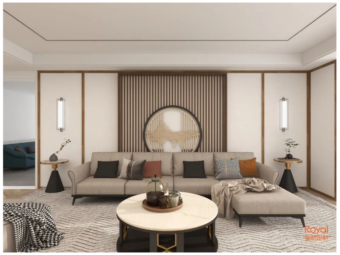 新中式风常见的简单背景,搭配沙发的柔软,没有一些沉冗修饰,在线条与空间比例上,将整体空间构造出,清雅灵空般的艺术韵味 在线影视, 。