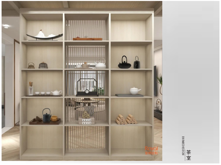 采用了传统格栅设计手法的储物架,茶室由此若隐若现, 草莓影视免费观看.