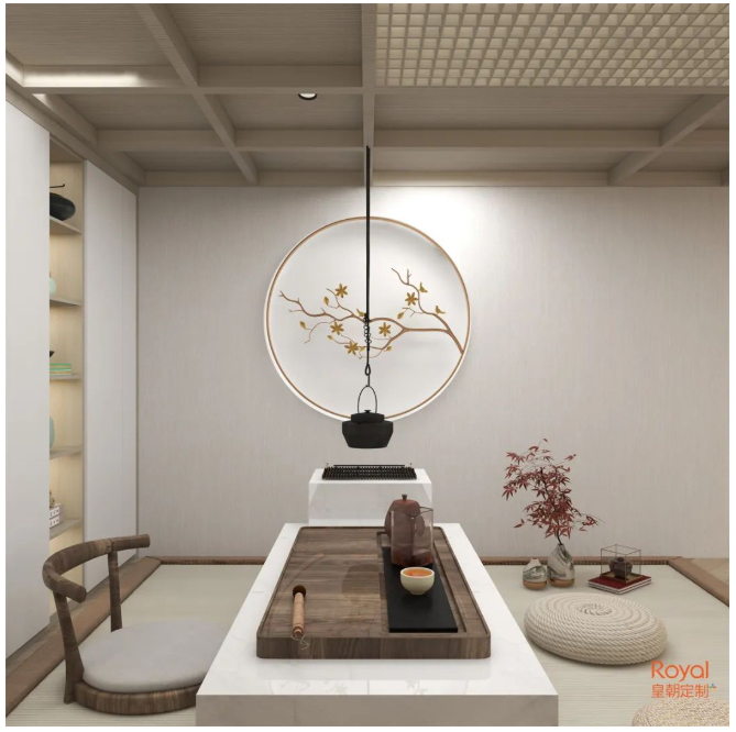 腊梅、山石、松柏,茶香袅袅,整个空间宁静致远的意境倍添韵致。