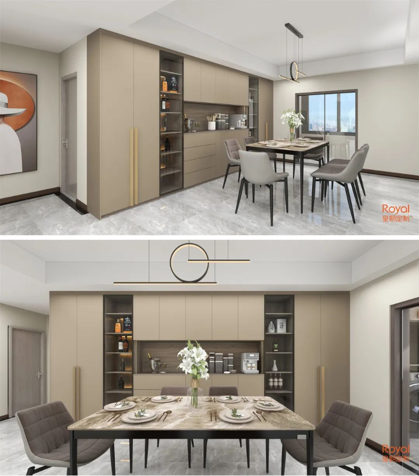 光线下色彩的跳跃,餐边柜做满墙,灰色的层次递进传达的是对潮流的思考。大气的岩板餐桌正好是品味的另一种体现。