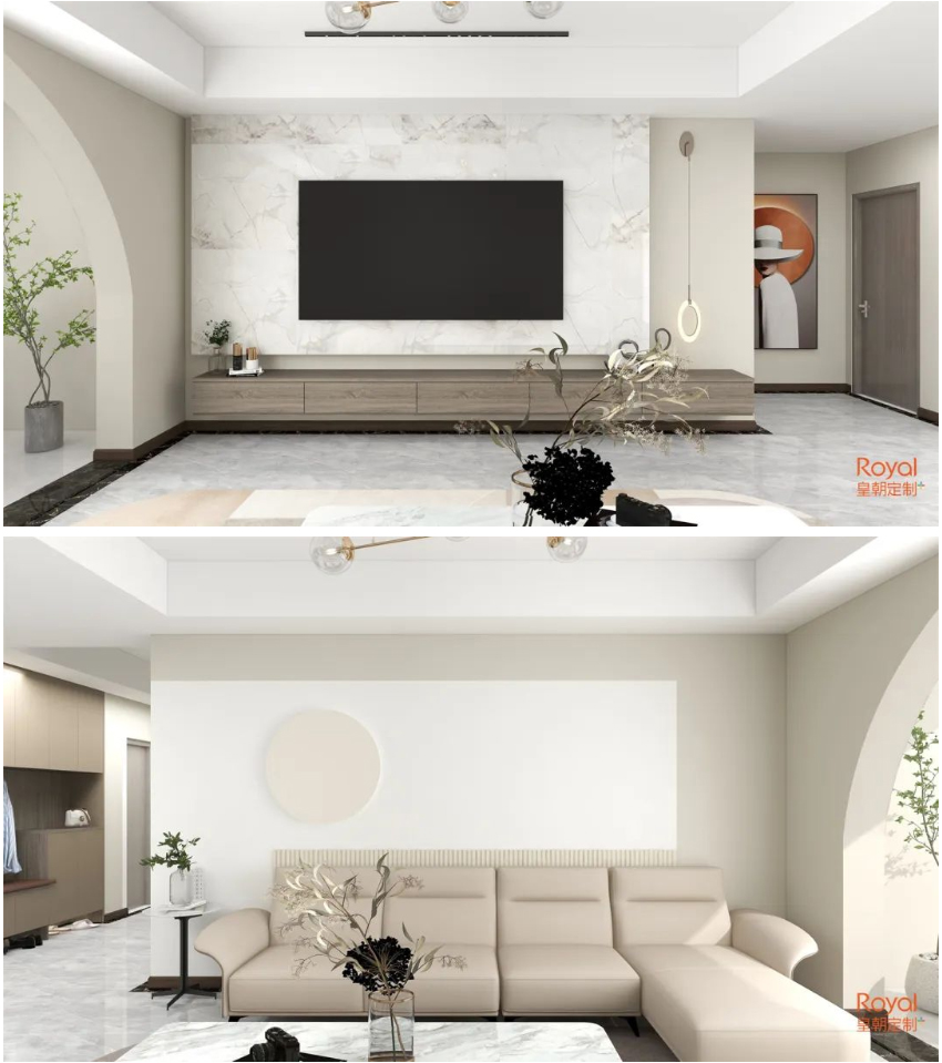 沐浴在阳光下,幸福感就如同光影般围绕在身边。阳台封闭,开辟出一方小小的休闲天地。一字型的电视柜搭配岩板背景,柔和的皮沙发泛着阳光的影子,舒适又慵懒。