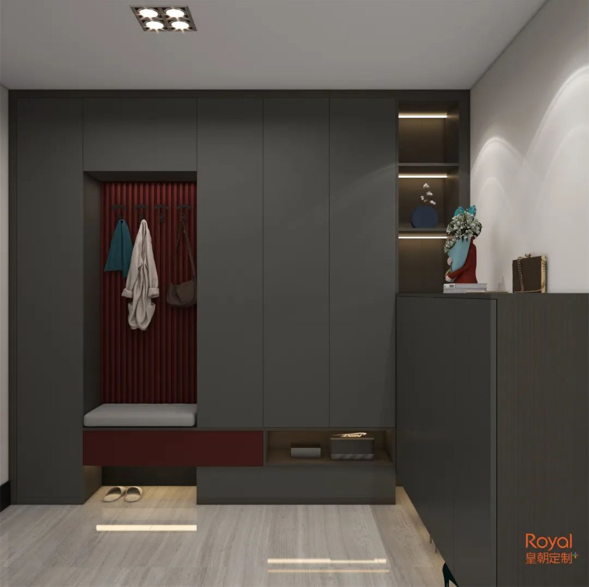 黑色和暗红色的搭配,是含蓄的高级,别致的轻奢,所以这方小小的玄关,利用灯带光泽的渲染,让空间充满了魔幻的魅力,略带复古,又个性新潮。