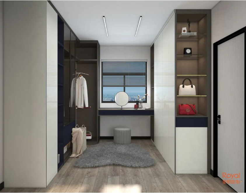 主卧承载着休息与夫妻之间的交流功能,色调上偏向和煦温馨。开辟出小小的衣帽间空间,床头上方的空间也利用上,保证了主卧收纳强悍却不会让空间冗杂。