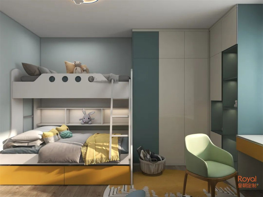 这是小房间的精彩妙用,上下铺的设计,有趣又好看。衣柜正好卡在角落处,也不会妨碍到孩子学习玩乐。