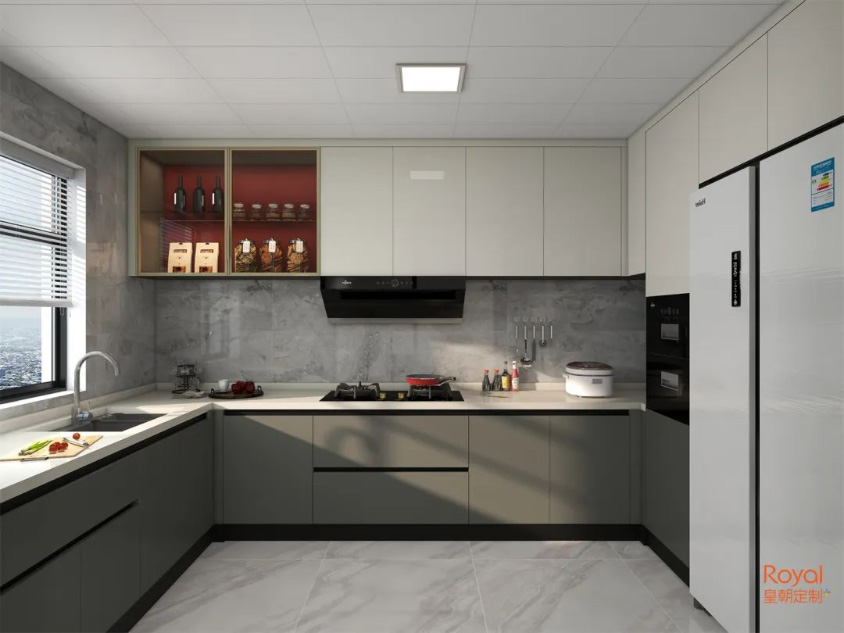 U型橱柜是常见的厨房布局,根据下厨活动路线设计橱柜功能分区,家电嵌入橱柜中,加入隐形拉手设计,空间视觉协调,使用感更赞!