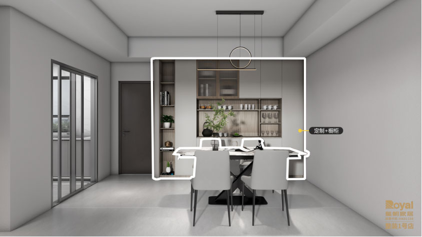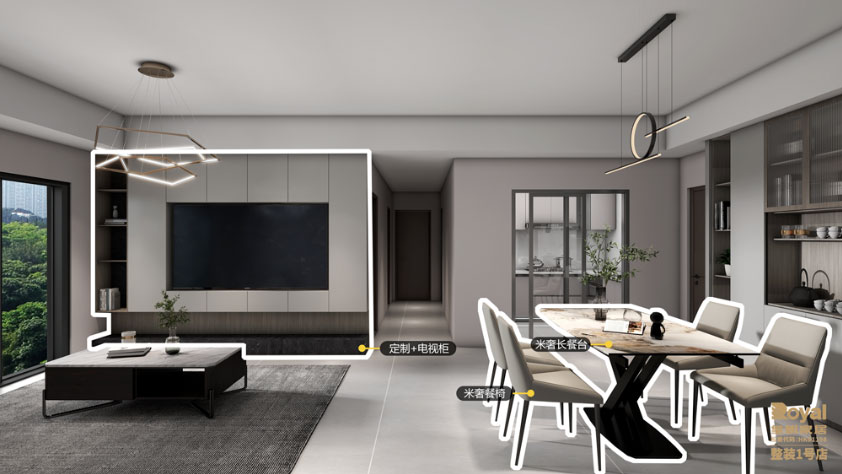 整体空间以时尚素雅的灰色调,通过不同深浅灰调营造空间的层次感,给人一种低调而有看点的感觉。我们草莓影视米奢品牌的家具风格是意式简奢,与“冷淡风”进行搭配可营造空间优雅与质感。设计师为餐厅选择以米奢的黑色五金岩板长餐台搭配米奢的仿皮灰调餐椅,桌面添加绿植、小饰品、异形吊顶灯等增加空间趣味性。