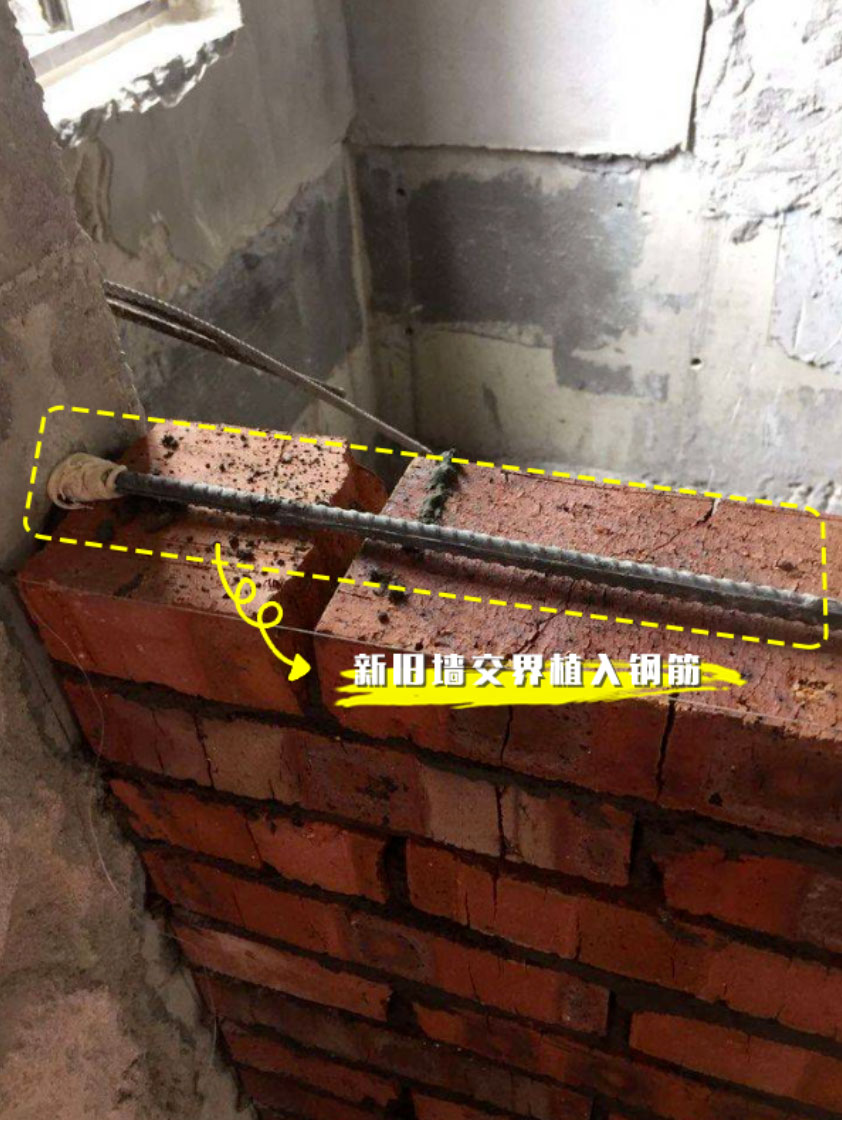 砌墙中的关键部分是新砌墙与原有建筑旧墙的连接工艺,这一步骤决定着墙体的稳定性和耐久性。铲掉靠近新墙的旧墙石灰层,然后凿出毛面,在旧墙与新建墙体连接处,选用外径6mm,长度不小于500mm的钢筋作为拉结筋,并在旧墙上打洞后插入钢筋。这些钢筋会与新砖墙一起砌进去,从而尽可能减少新墙和旧墙之间开裂的风险。