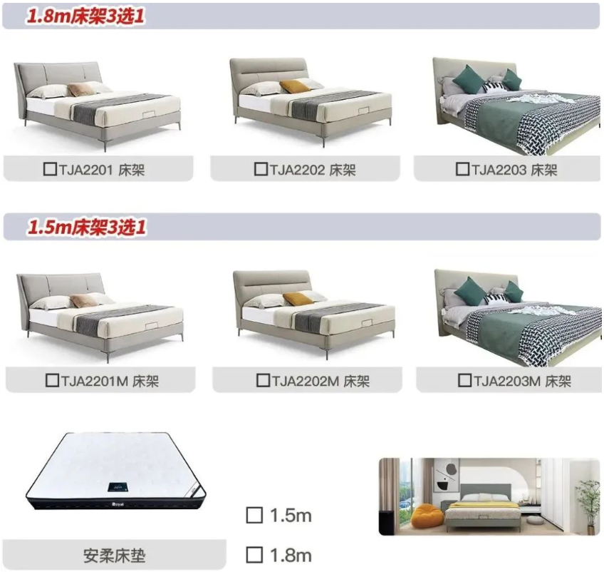 TJA2203床架(1. 8m)*1+1. 8m安柔床垫*1+TJA2203M床架(1 草莓影视. 5m)*1+1. 5m安柔床垫*1+TJC2201B床头柜*2 .