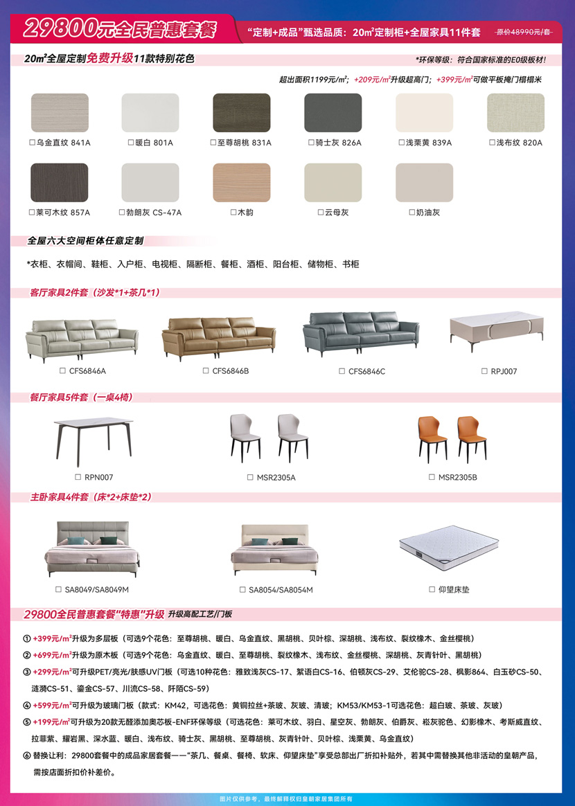 双节全屋定制特惠第三重,甄选品质29800元“定制+成品”套餐,套餐包含 20㎡定制柜+全屋家具11件套 在线影视,其中全屋家具涵盖了客厅,餐厅,卧室三大空间家具,严格把控颜值和品质,一站式搞定整家,为您省时,省力又省心,真的是实力出圈, 。