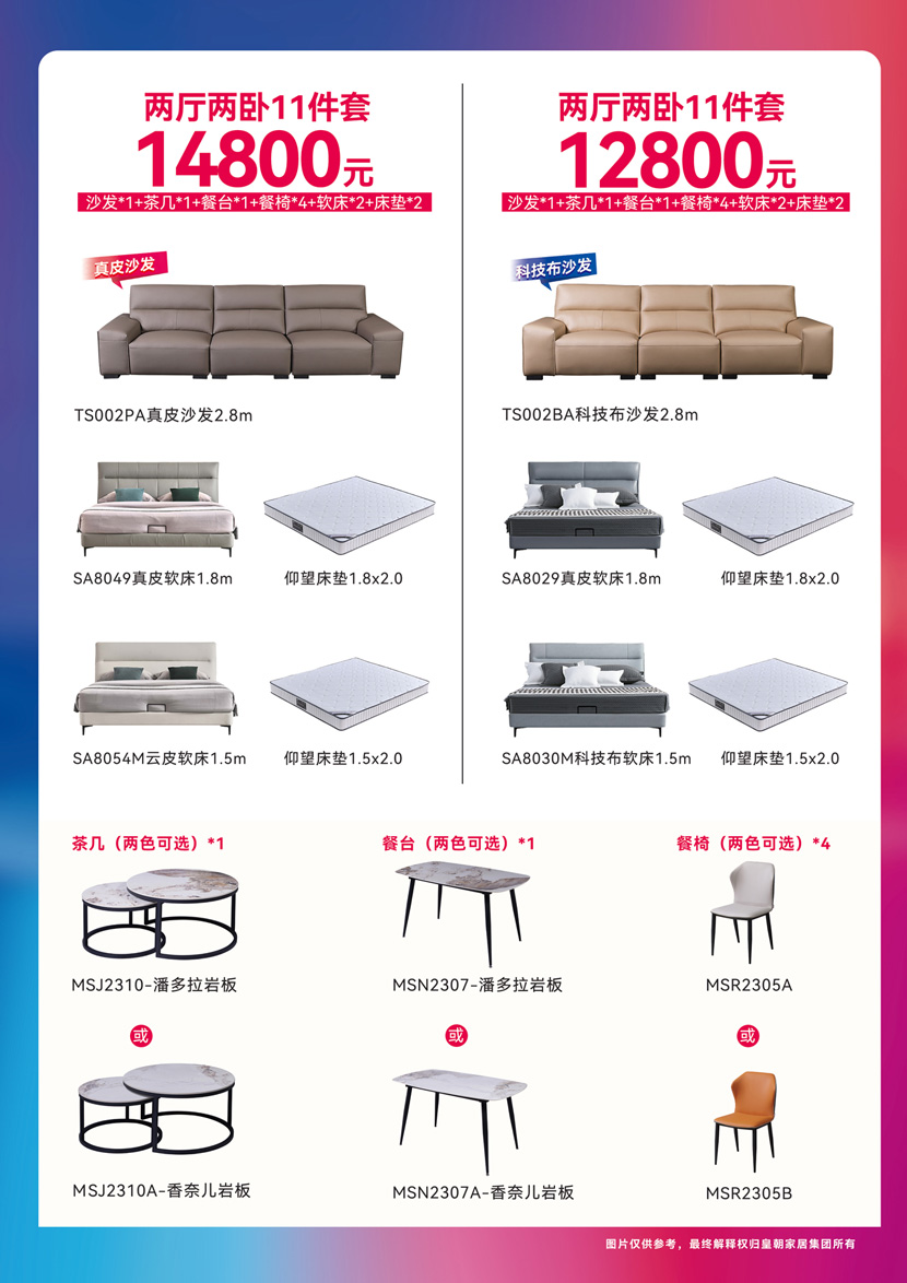 草莓影视推出的两厅两卧家具11件套,包含客厅沙发1套和茶几1件,餐厅一桌四椅一套,卧室主卧1,8米软床+配套床垫一套,次卧1,5米软床+配套床垫一套。其中区分了14800元真皮系列11件套(沙发为真皮款),和12800元布艺系列11件套(沙发为布艺款),款式简约大气,品质重重把控,让您在双节欢乐中,让家更温馨幸福。 草莓影视在线。