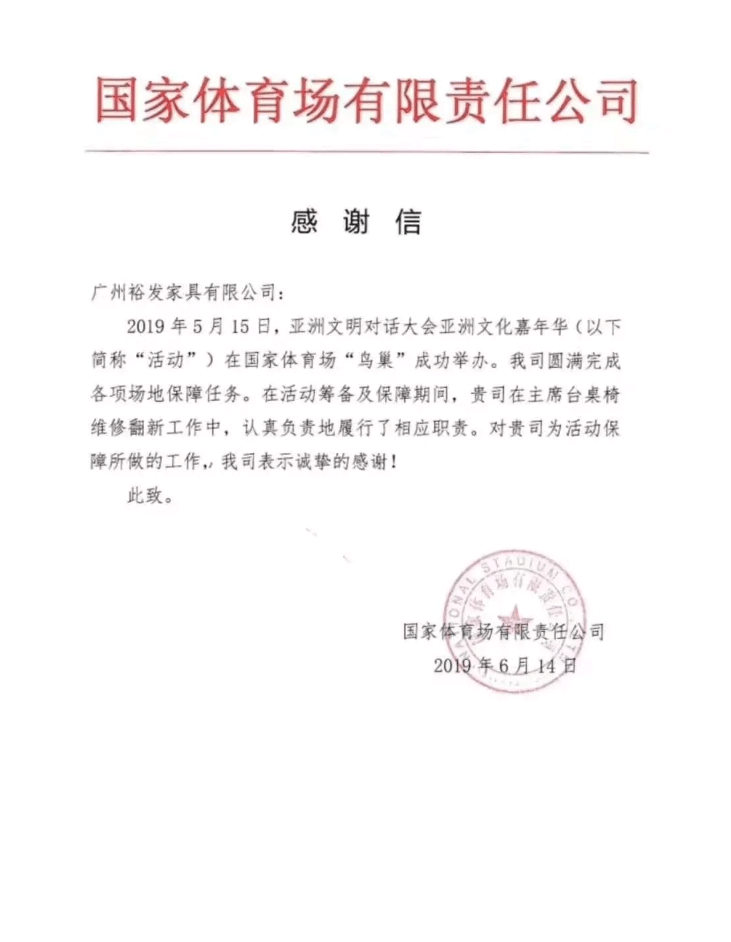 事实上,这样珍贵的礼物并非皇朝首次获得,2019年初,受国家体育场所托,为配合亚洲文明对话大会亚洲文化嘉年华的成功举办,皇朝对2008年所赞助供应的主席台桌椅进行了全面翻新,为活动的顺利举行贡献力量。