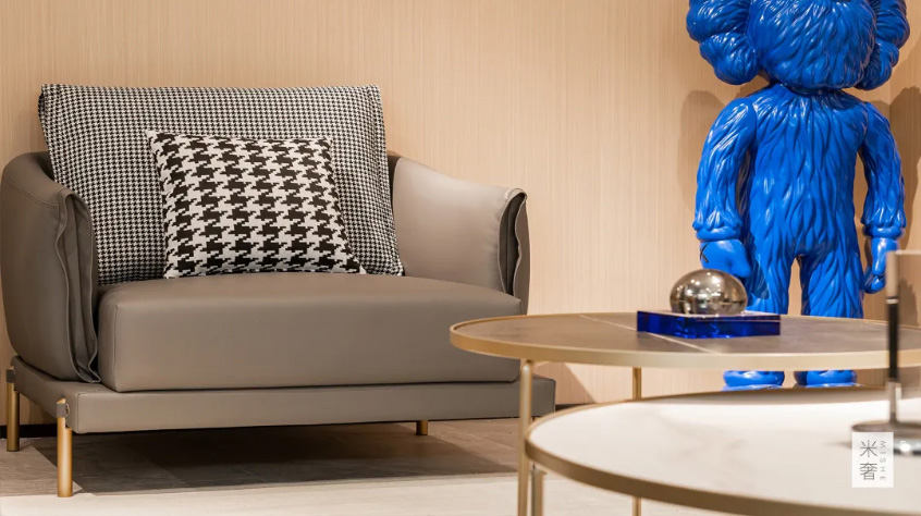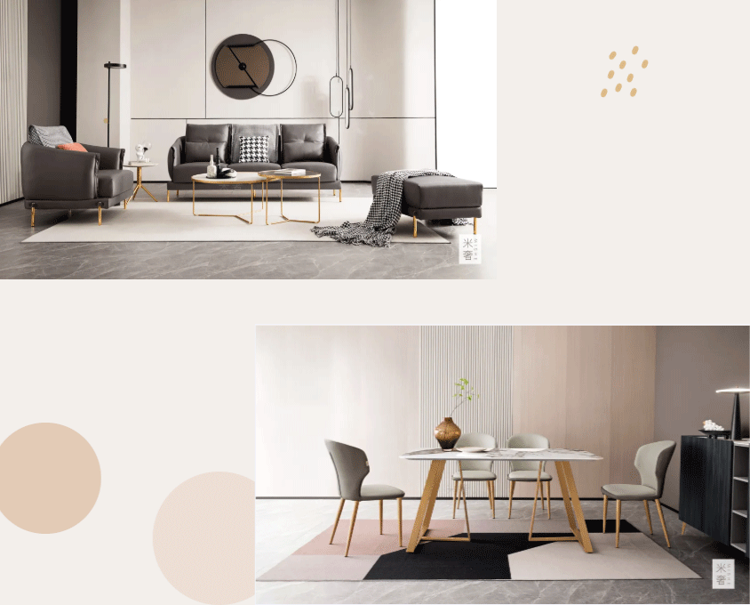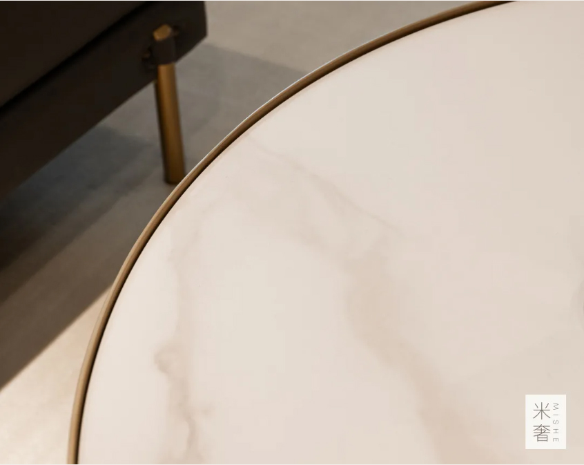 整体空间通过将奢华的金色,干净的白色和沉稳的咖色,附着于金属、皮革、布艺、岩板材料家具之上,让色彩与材质刚柔并济,绽放出精致浪漫的生活美学。
