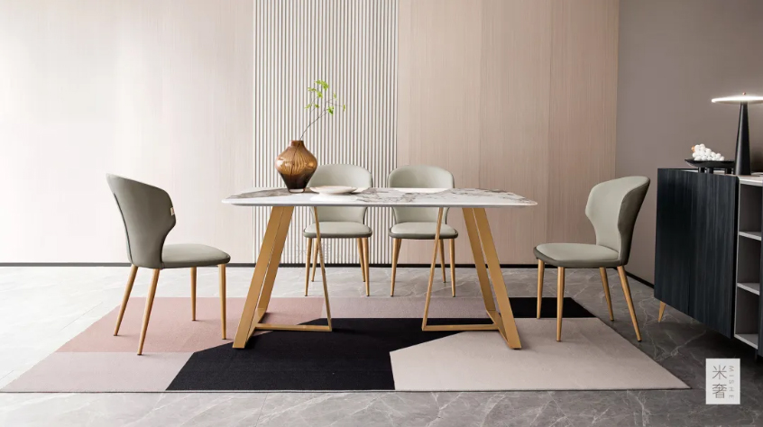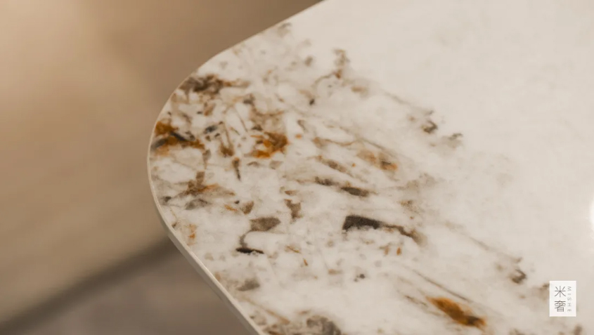 餐台的奢石岩板,纹理独特,仿若带着柔情蜜意步入夜色与晨曦,在日暮交替的刹那,碰撞出自然的韵律。