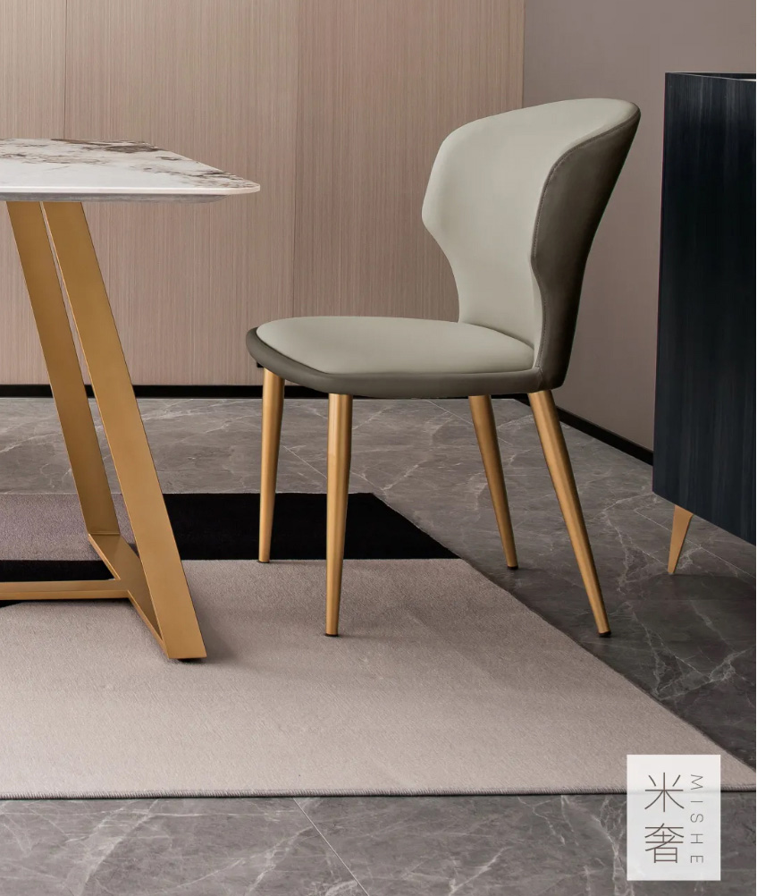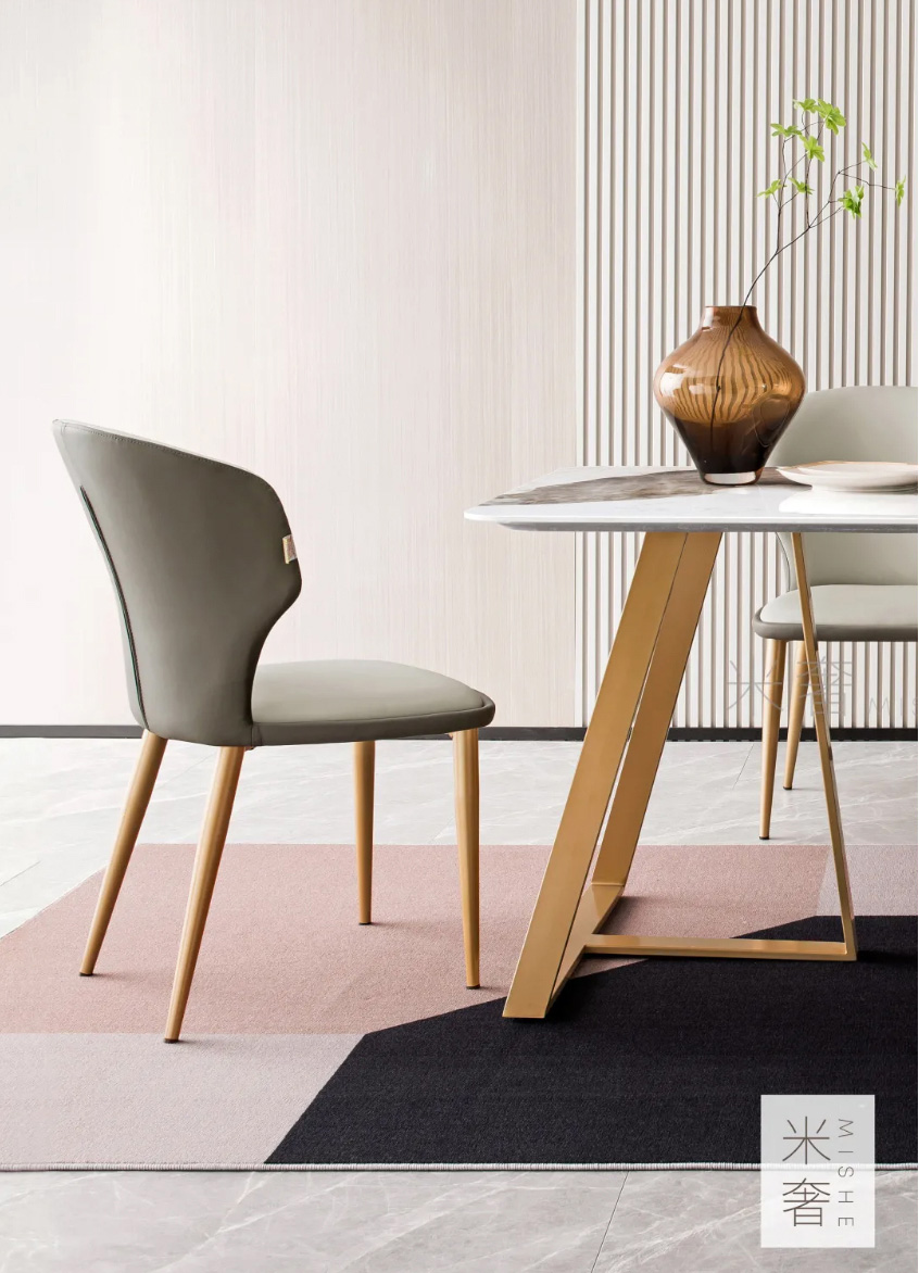 皮革质感的餐椅设计与坚实稳固的金色支脚,碰撞擦出柔软与坚硬的火花,让充满烟火气息的餐厅焕发出新的活力。