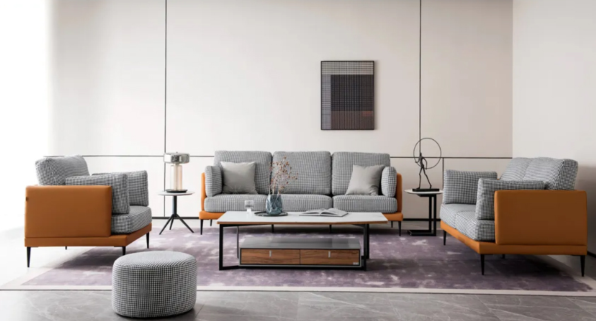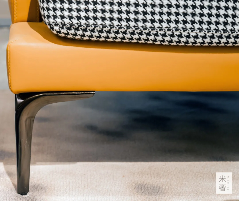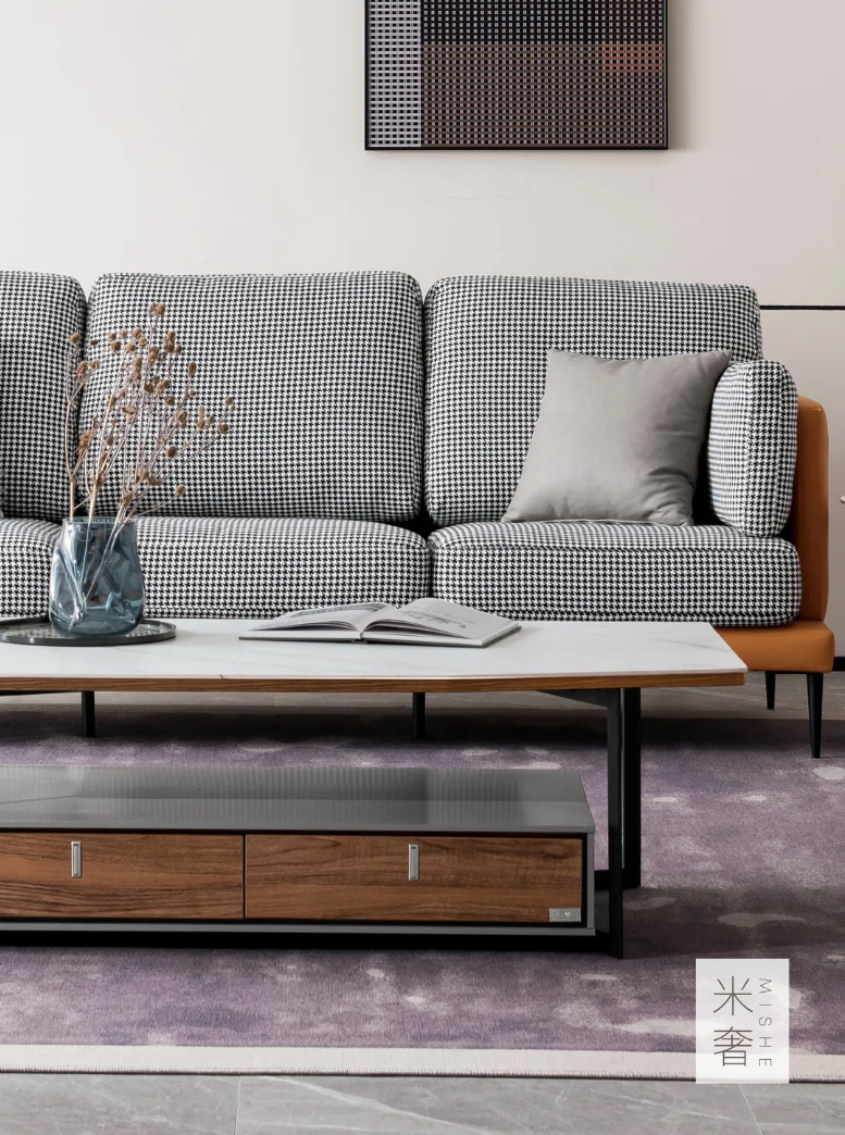 布艺材质中融入千鸟格元素,搭配爱马仕橙皮革,营造出一种时尚典雅的高级空间艺术氛围感。