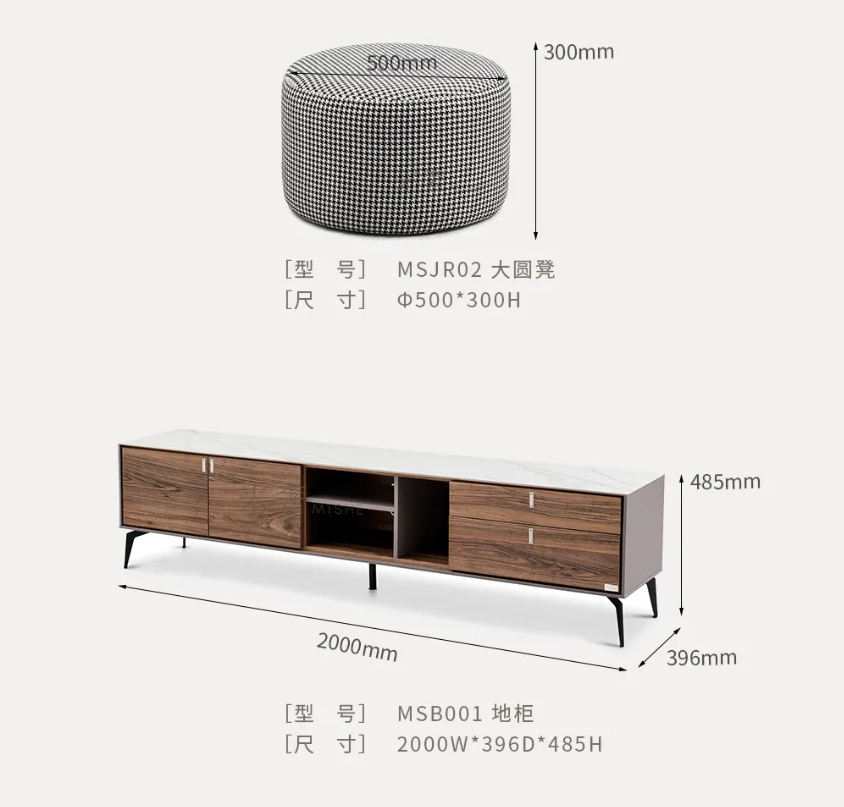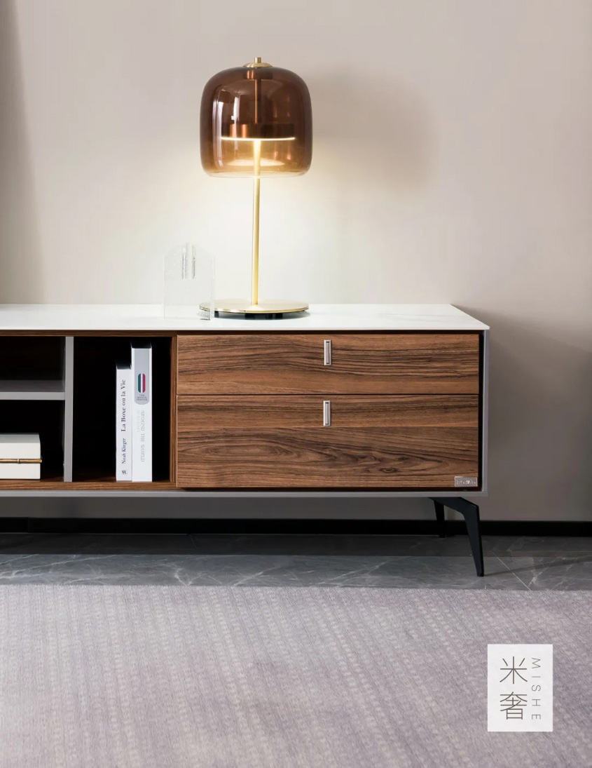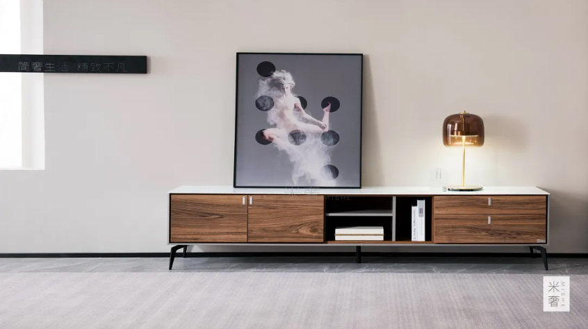 客厅空间选用一字型的地柜式电视柜,纤细高脚的设计,不仅提升空间层次感,还让日常清洁不再是难事。而岩板台面搭配橡木色柜体,简单自然,营造出舒适放松的居家氛围。