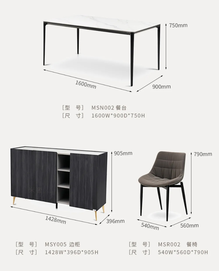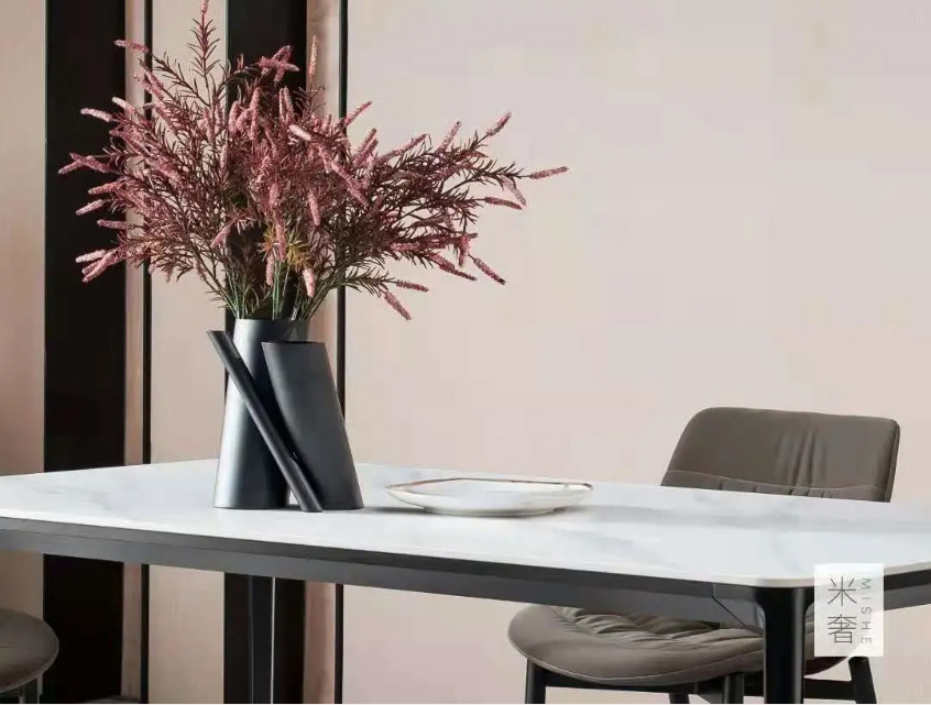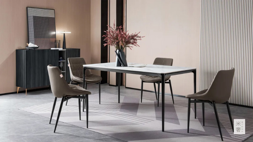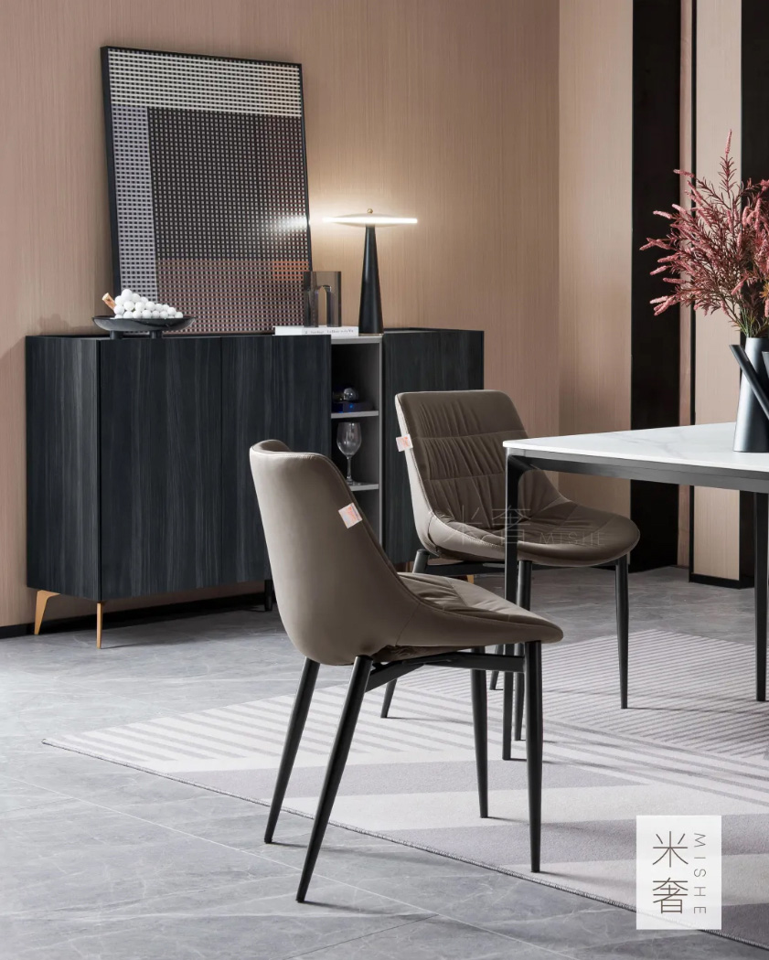 科技布餐椅搭配黑色金属支脚,提升空间的张力和层次,实现不同元素之间的融合,置身于此,舒适又惬意,情感也能得到更好地表达。