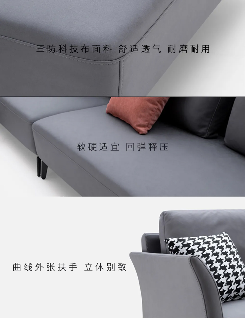 深灰色L型三防科技布沙发方正有力,曲线外张式扶手立体别致,搭配经典千鸟格,点缀珊瑚红抱枕,舒适的饱和度配色营造都市雅致,简约的设计恰到好处地缔造栖居之所。