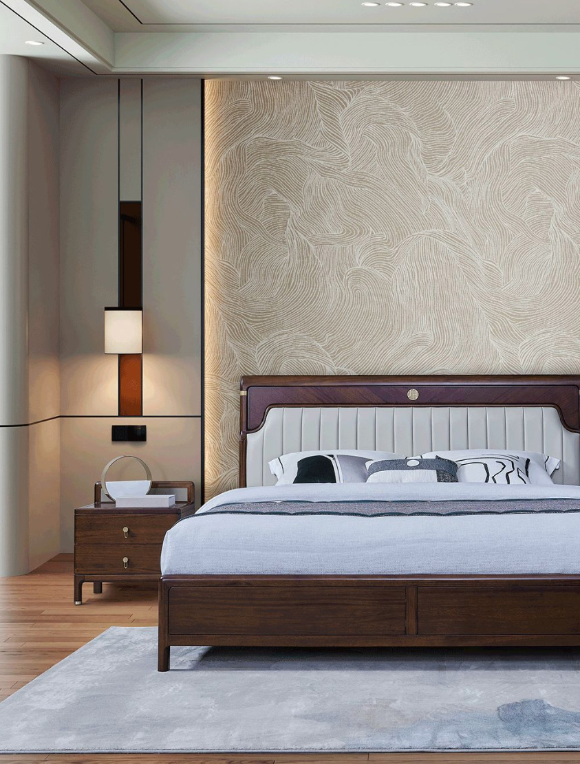 集禾系列新中式风格卧室用纤尘不染的素雅淡然,洗涤生活的纷忧繁杂,构建一派岁月静好,让都市人在闲居之时亦能感受到安详自在、和舒自如。