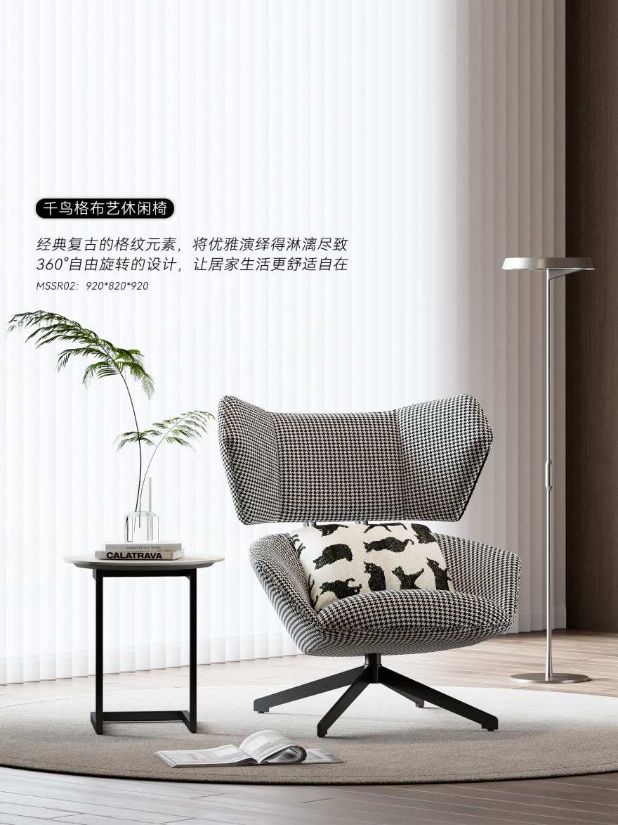 ① 千鸟格布艺休闲椅:经典复古的格纹元素,将优雅演绎得淋漓尽致;360°自由旋转的设计,让居家生活更舒适自在。