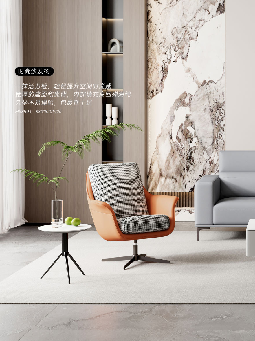 ② 时尚沙发椅:一抹活力橙,轻松提升空间时尚感;宽厚的座面和靠背,内部填充高回弹海绵,久坐不易塌陷,包裹性十足。