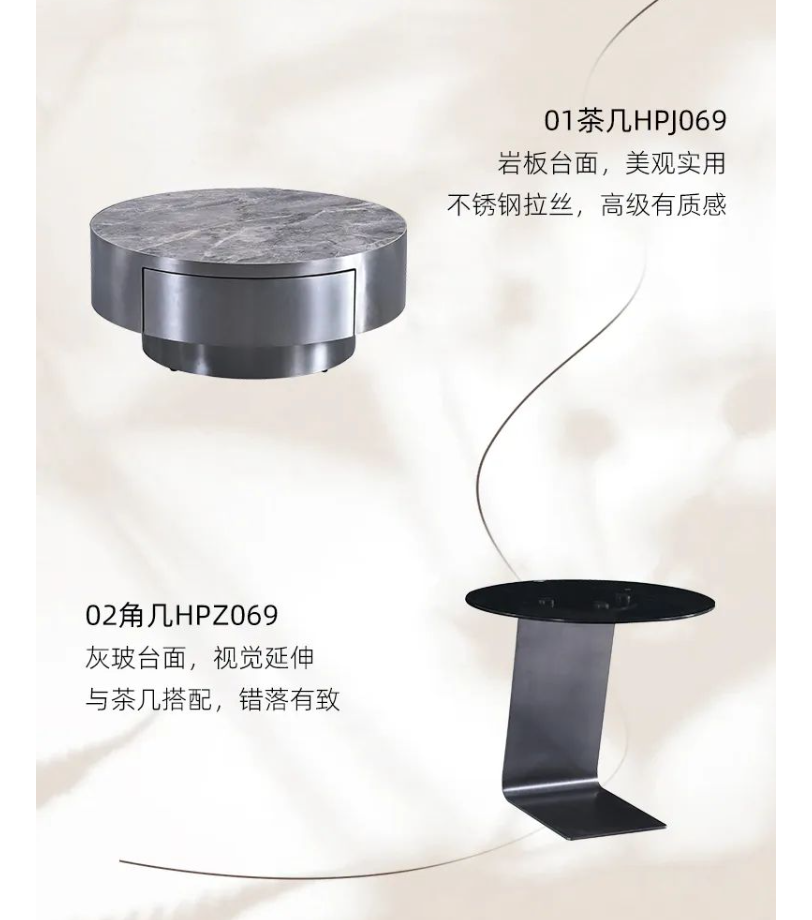 01茶几HPJ069 岩板台面 草莓影视在线,美观实用 不锈钢拉丝,高级有质感 02角几HPZ069 灰玻台面,视觉延伸 与茶几搭配,错落有致 .